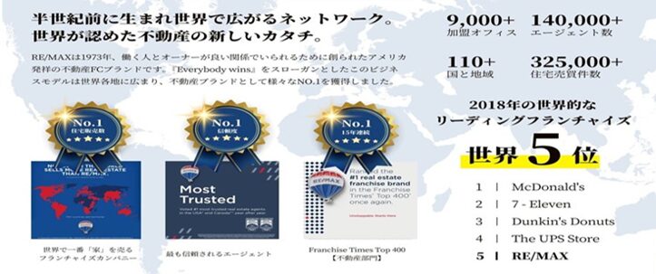 - 1973年にアメリカ・デンバーで創業されたRE/MAXは、現在世界110カ国以上に約9,000のオフィスを展開し、14万人以上のエージェントが所属するグローバルブランドです。